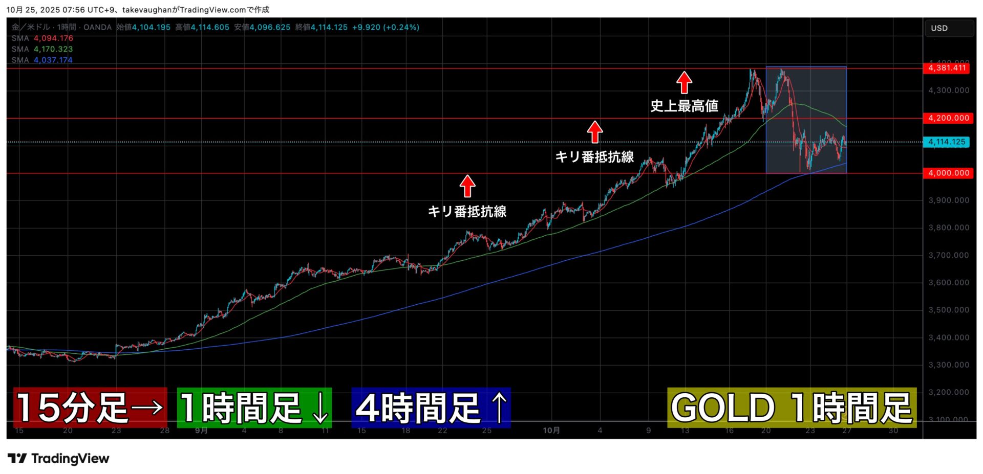 上の画像がゴールドの1時間足の「マルチタイムフレーム分析」を行なったチャートになります。