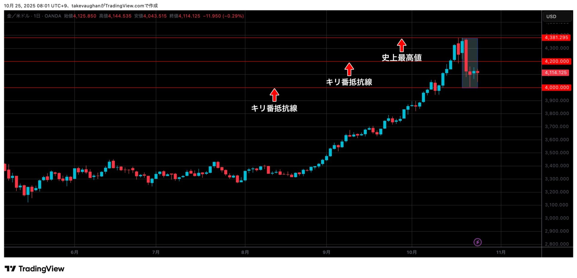 前週まで長らく続いた急上昇相場にブレーキがかかった週となったゴールド相場ですが、4000$のサポートラインで踏みとどまって再度上昇できるのか、4000$を割り込む展開に入るのか注目されます。