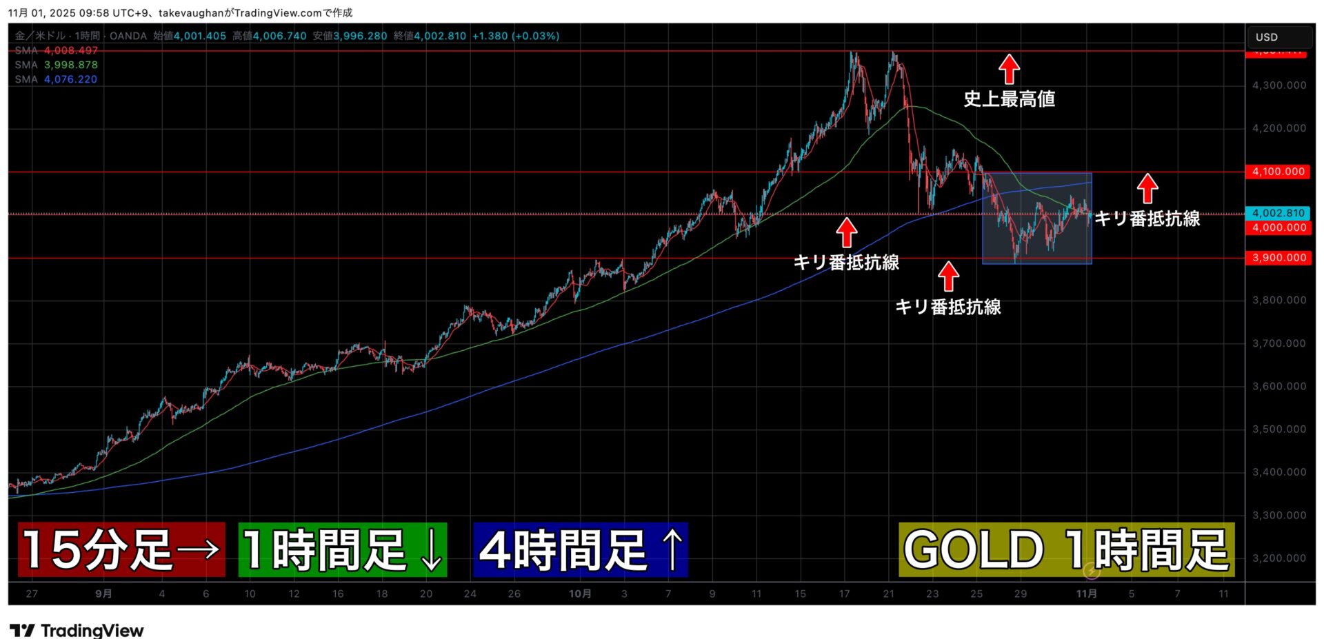 上の画像がゴールドの1時間足の「マルチタイムフレーム分析」を行なったチャートになります。