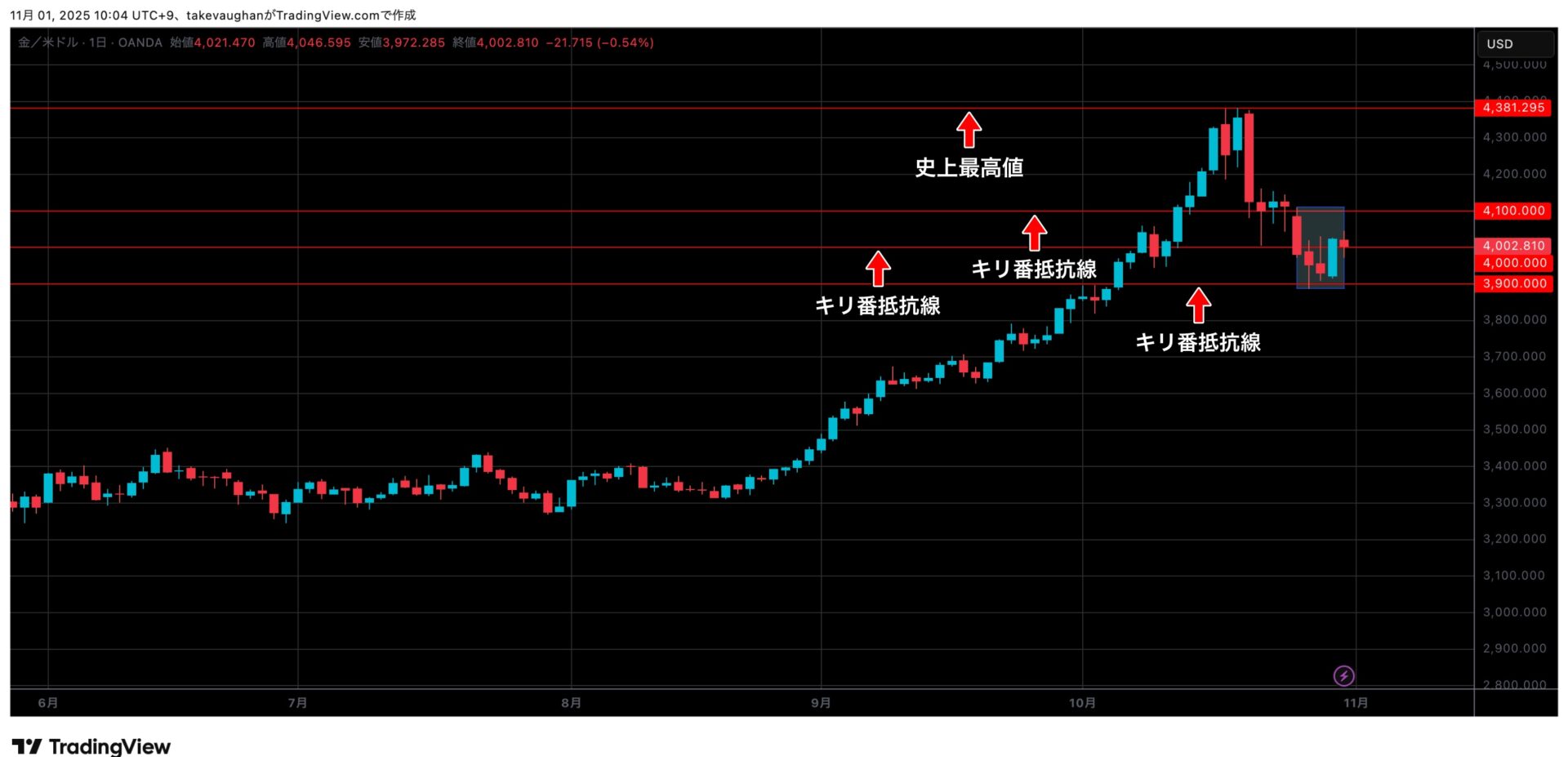 10月31日金曜日はキリ番抵抗線の4000$ラインとほぼ重なる4001.50$で閉場を迎えています。