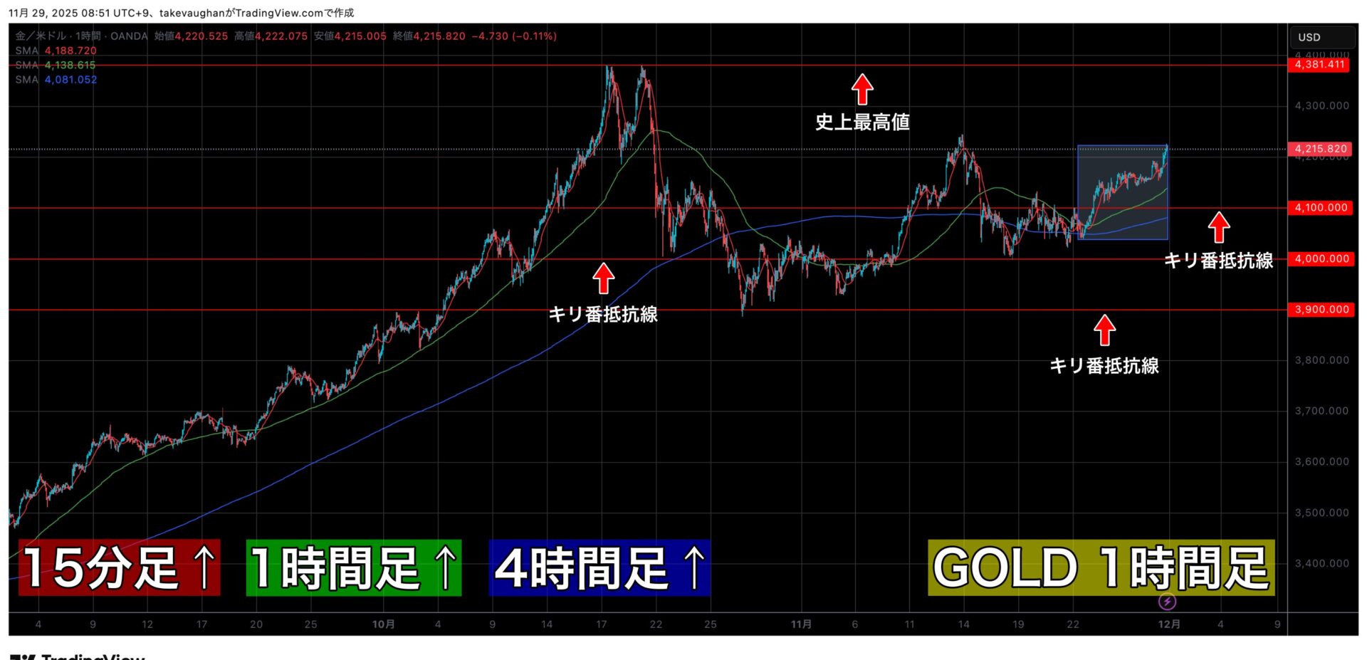 上の画像がゴールドの1時間足の「マルチタイムフレーム分析」を行なったチャートになります。