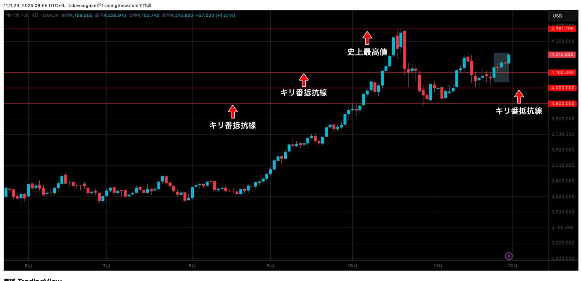 4200$は前回高値付近となりますので、ここがレジスタンスラインとなるか、サポートラインとなるか今週始めの動きによって見極めが大事な場面です。