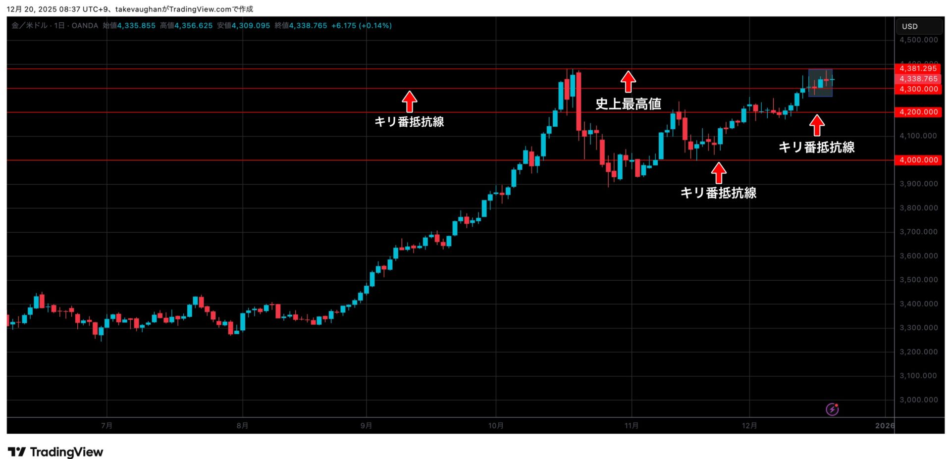 週間最高値は18日(木)の4374$で、史上最高値の4381$に迫ったものの上抜けするには至らず、19日(金)は4339$で閉場となっています。