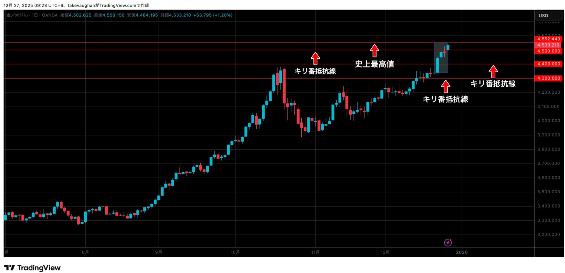 史上最高値は前述の通り4550$に更新し、高値をキープしたまま4532$で閉場を迎えています。