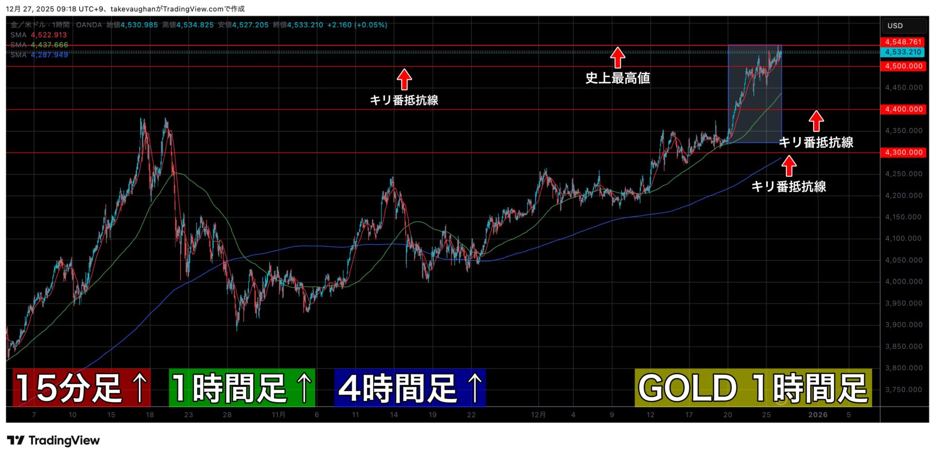 欧米のクリスマス休場を挟んで、一気に4500$を超える勢いのある上昇相場でした。