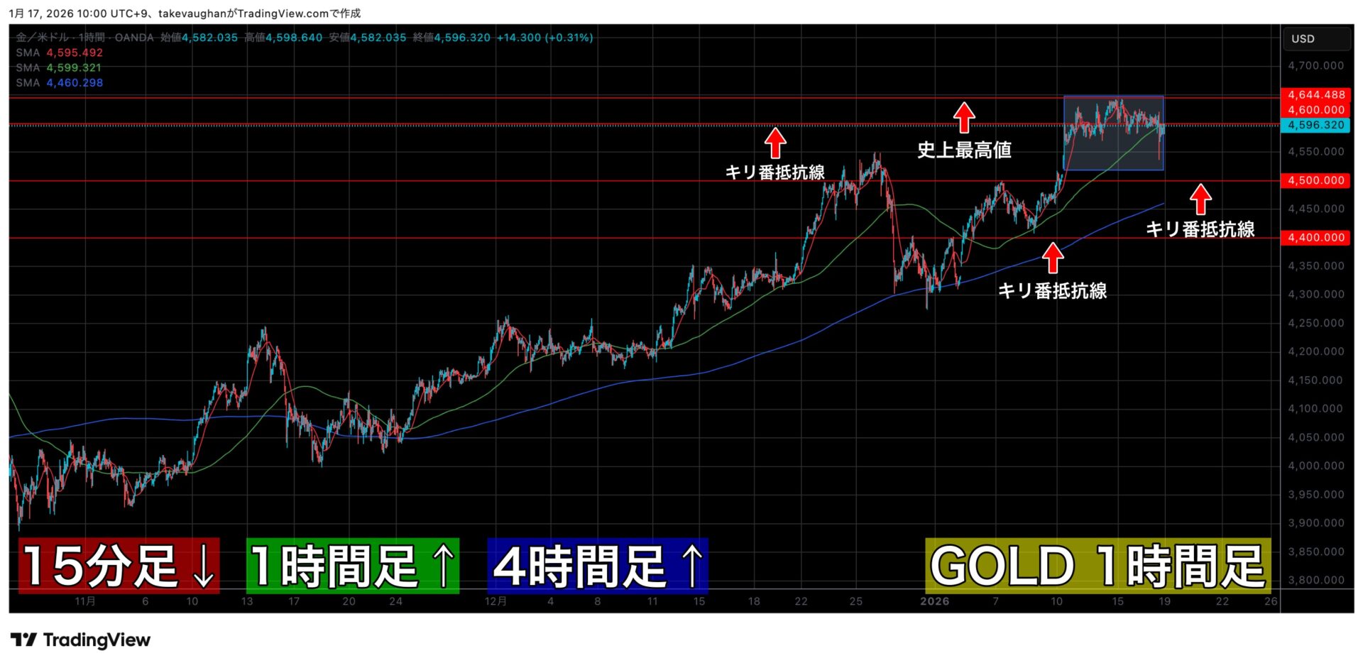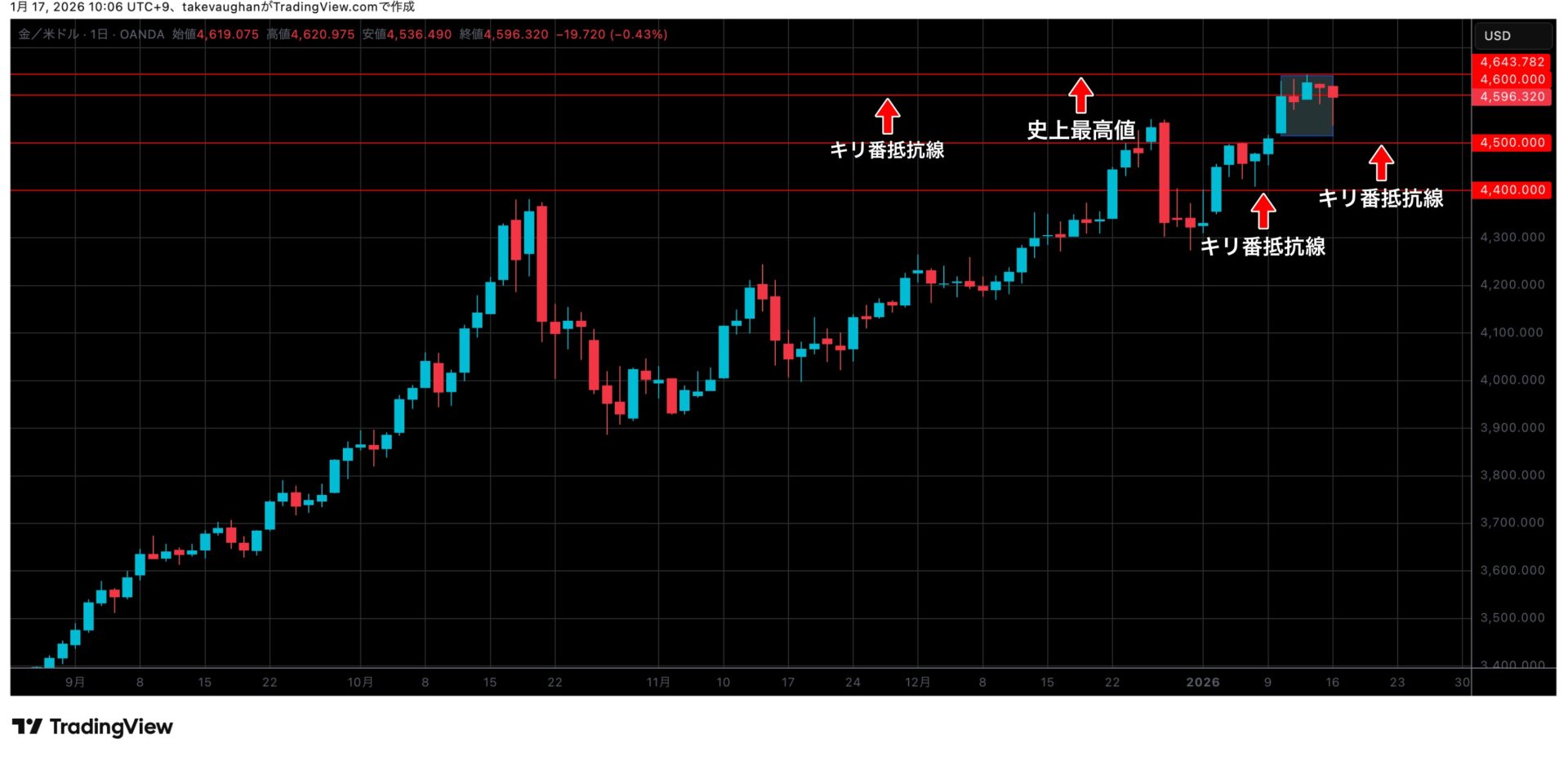 週末に向けては4600$のキリ番を挟んでの攻防となり、1月16日(金)は4596.5$で閉場となっています。