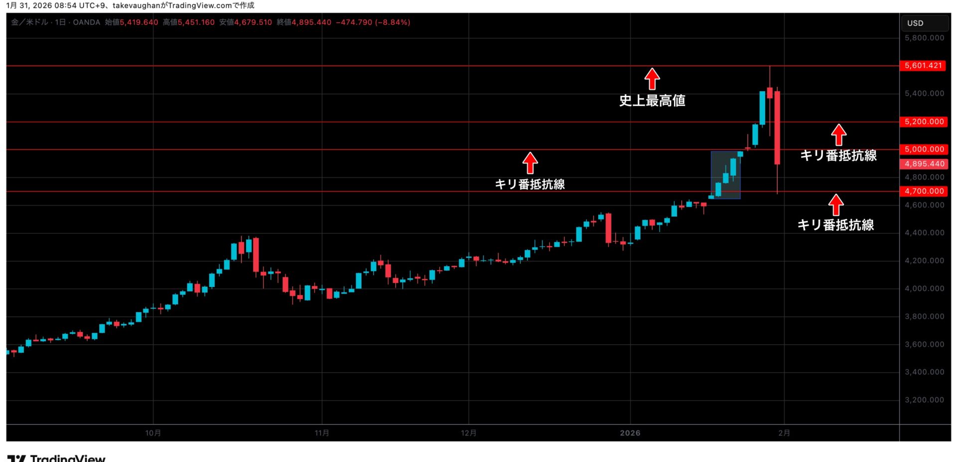 先週のゴールド相場を日足で見ると、週始めは大陽線2本で史上最高値の5600$に到達後、1700pipsの上髭をつけて暴落、そこから2700pipsの下髭をつけて上げ戻すも、週末には記録的な特大陰線で記録的な下げ相場となりました。