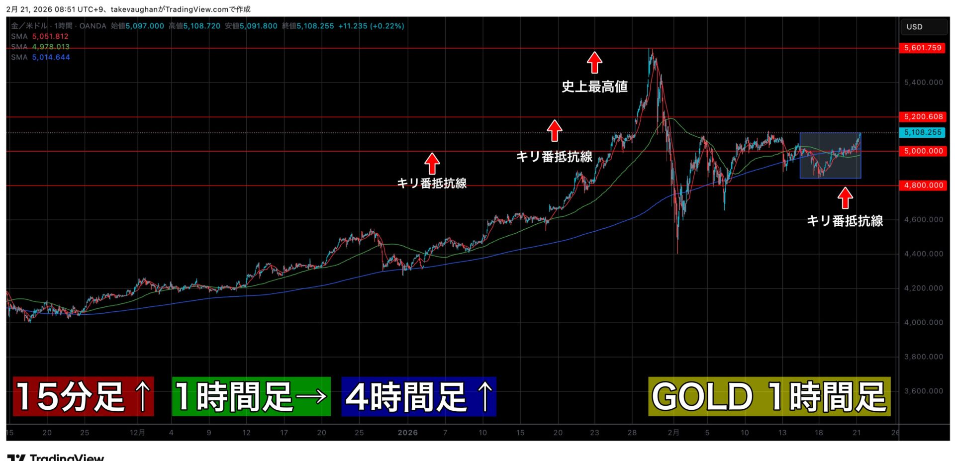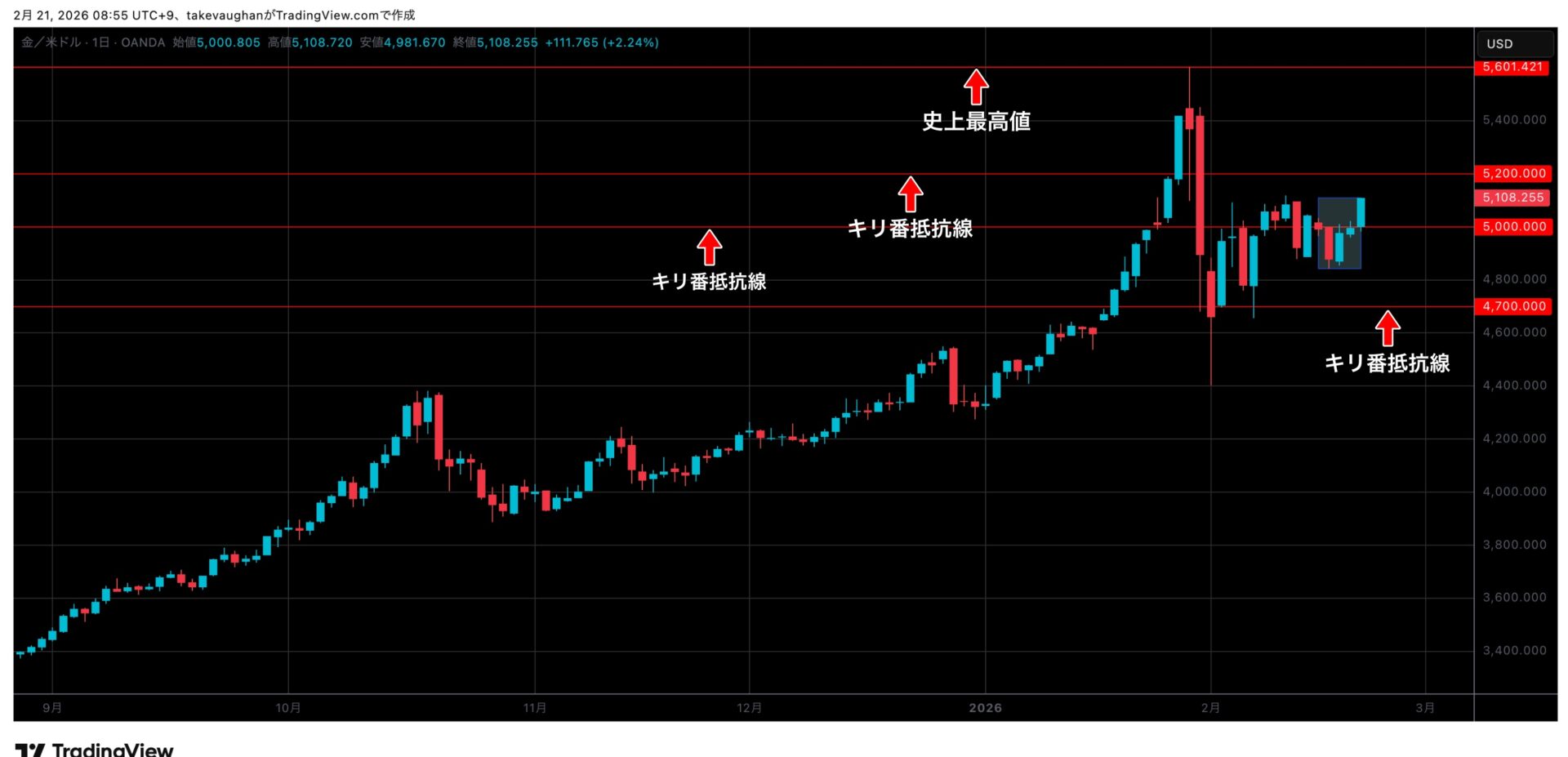前回高値の5100$を上抜けするのか、それとも抵抗線となって反発するのか、月曜日の朝は特に方向性にご注意ください。