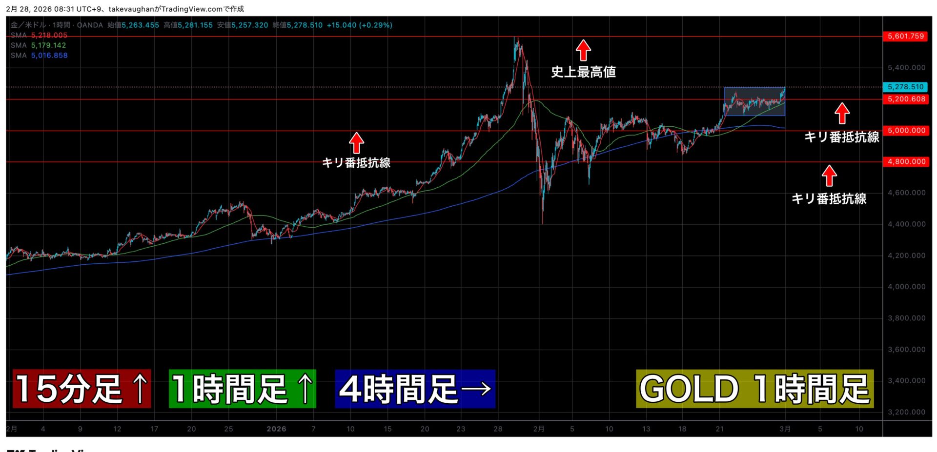上の画像がゴールドの1時間足の「マルチタイムフレーム分析」を行なったチャートになります。