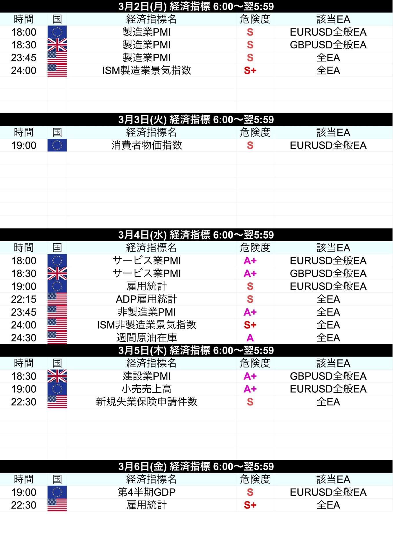 | 時間 | 国 | 経済指標名 | 危険度 | 該当EA |