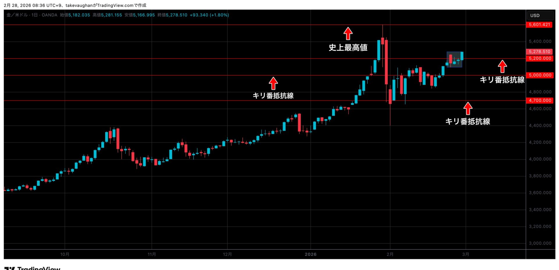 金曜日後半には再び上昇し、2月2日以来の5250$超えを記録し、5278$で閉場を迎えています。