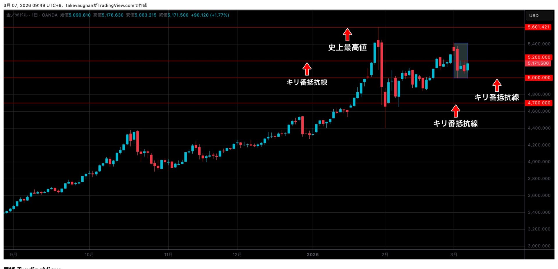 その後水曜日からは5200〜5050$の間でレンジ的な動きとなり、週末の金曜日には少し上げ戻した5173$で閉場を迎えています。