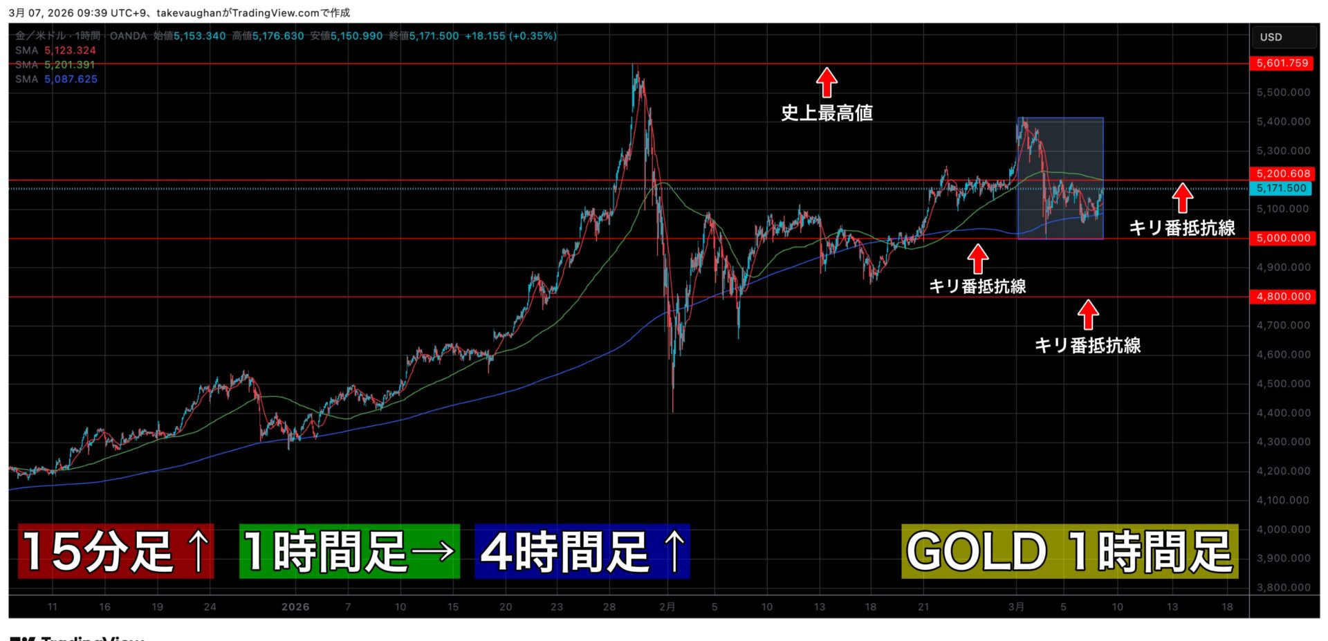 上の画像がゴールドの1時間足の「マルチタイムフレーム分析」を行なったチャートになります。