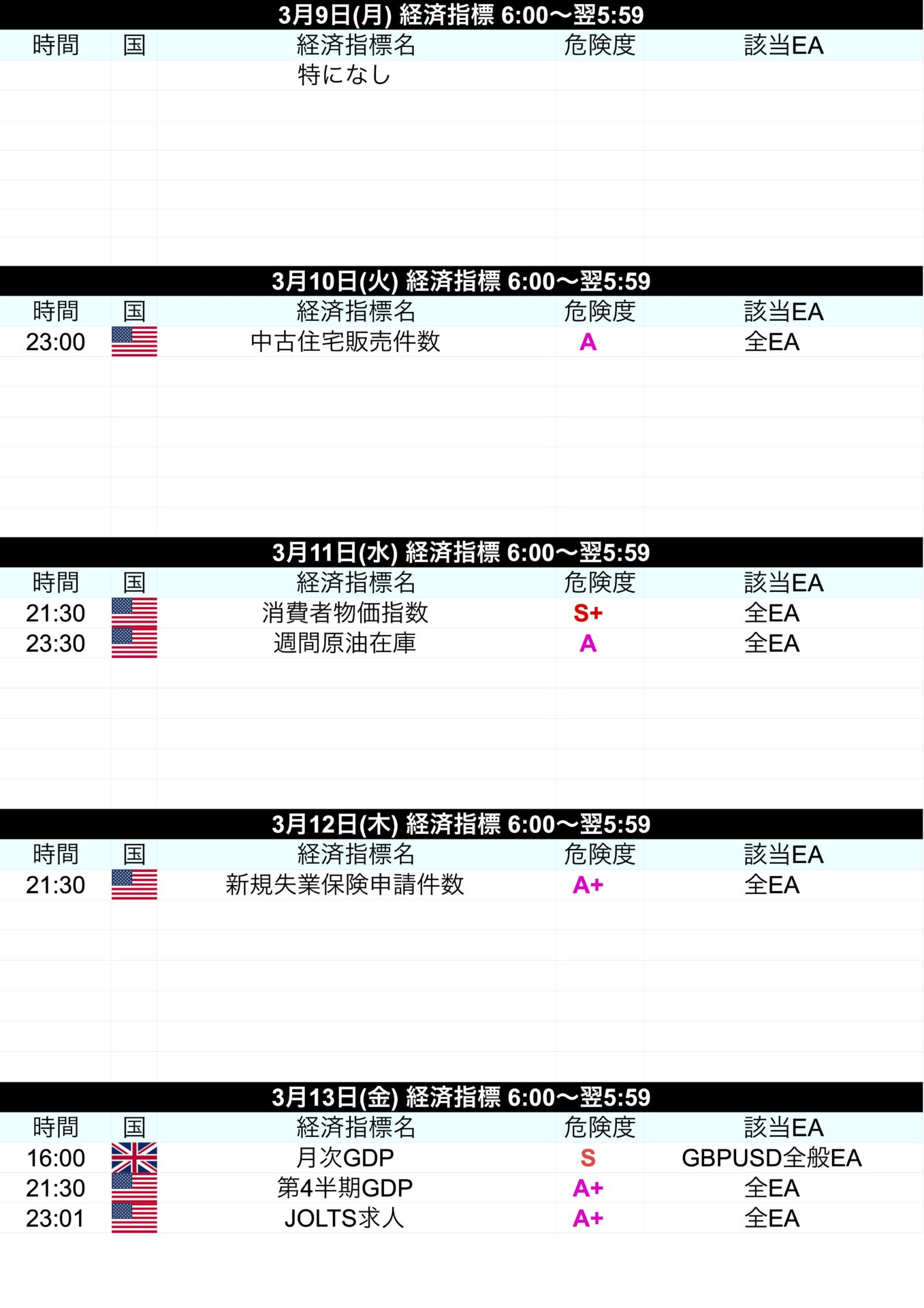 | 時間 | 国 | 経済指標名 | 危険度 | 該当EA |