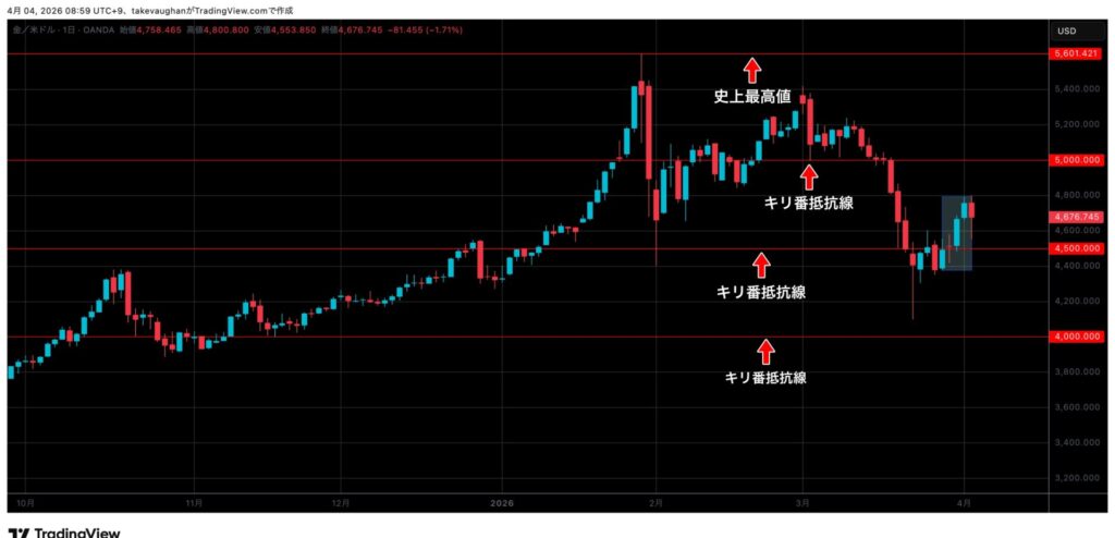 週末金曜日は状況が変わり、開場直後に週間最高値の4800$をつけた後、ここを天井として一気に4550$まで急落、その後揺れの大きな相場を見せながら上げ戻し、4675$付近で閉場を迎えました。