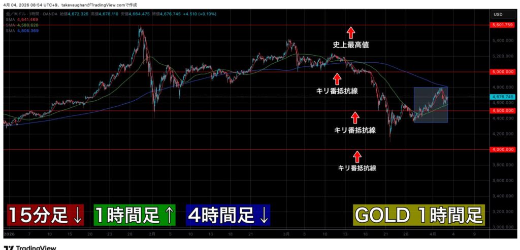 上の画像がゴールドの1時間足の「マルチタイムフレーム分析」を行なったチャートになります。