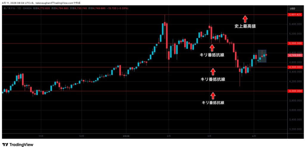 青色の四角で囲ったところが先週のゴールド相場になります。