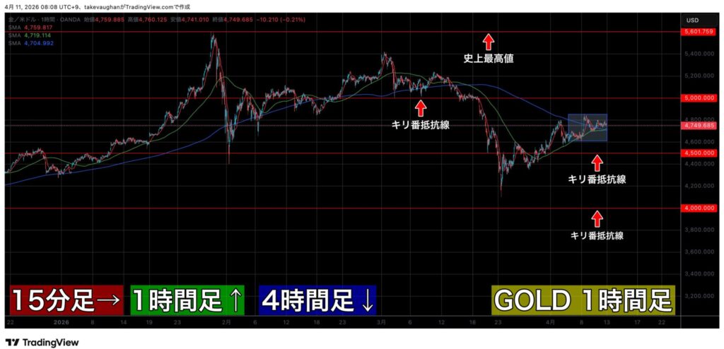上の画像がゴールドの1時間足の「マルチタイムフレーム分析」を行なったチャートになります。