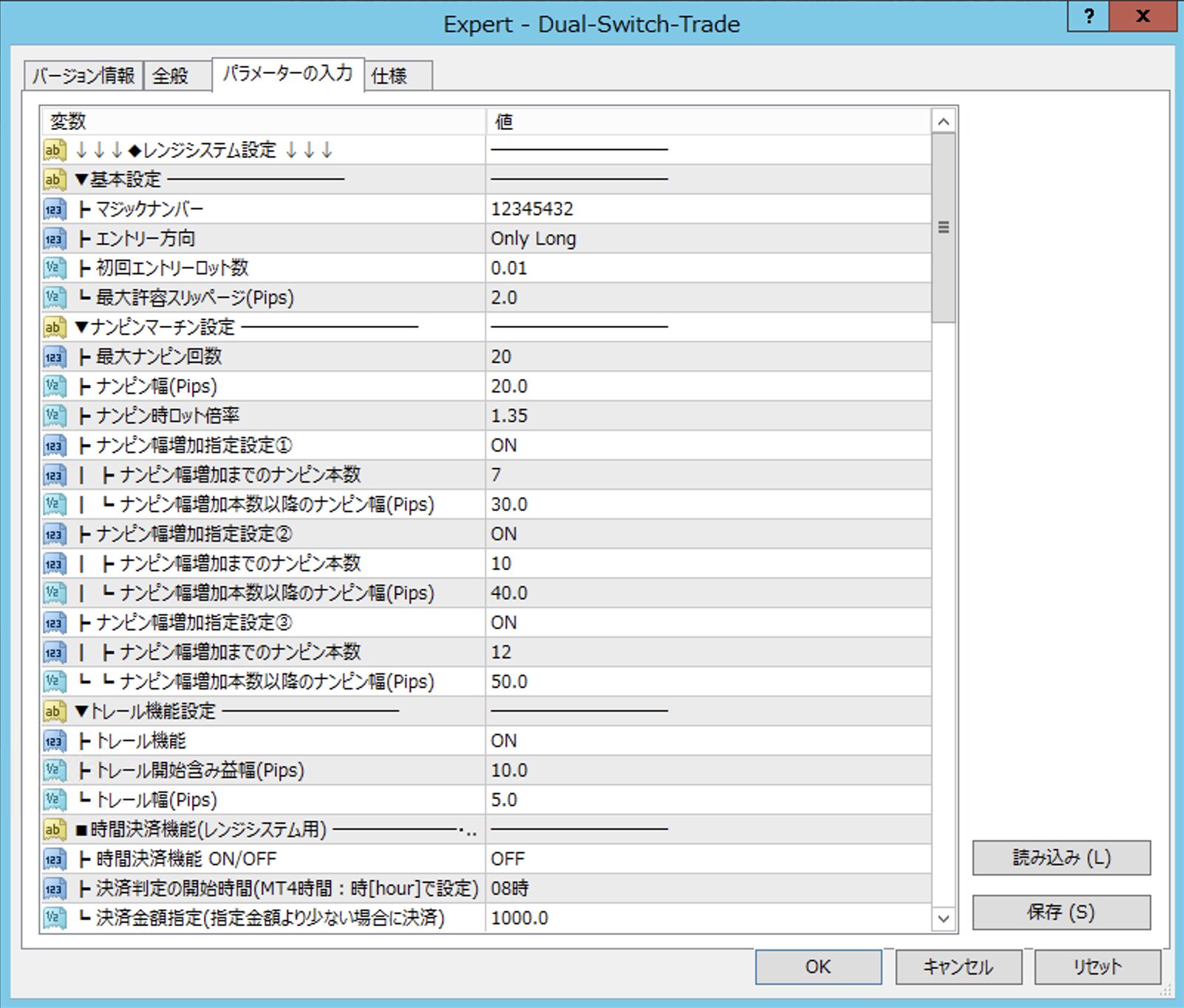 例えば、初期ロットが0..02で「①ロット倍率変更の保有ポジション数」を「3」、「①ロット倍率」を「1.5」とした場合、3つ目の保有ポジションからロット倍率が1.5倍となりロットは0.03となります。
